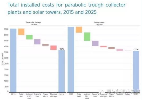 光伏成本持續(xù)下降,那么光熱發(fā)電成本如何變化呢?以7.5-9小時儲能容量為例,160兆瓦槽式光熱電站裝機成本可望下降33%,從5.5美元/瓦下降到3.6美元/瓦;而150兆瓦塔式光熱電站成本可望下降37%,從大約5.7美元/瓦降至3.6美元/瓦。